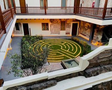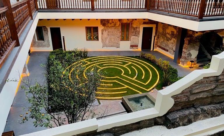 Transitar un laberinto unicursal, nos conduce a recuperar nuestro centro...nuestro equilibrio. Recuperar el sentido y significado de cada evento que vivimos. Cinco circuitos y cuatro orientaciones. Un viaje iniciatico al despertar de la Consciencia.